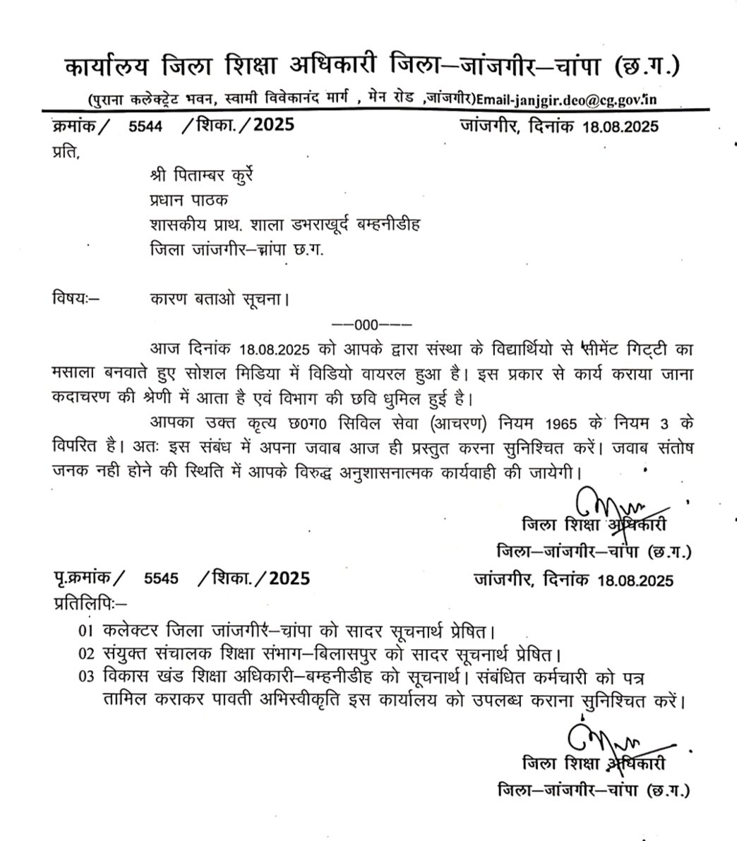 जांजगीर-चांपा. शासकीय प्राथमिक शाला डभराखूर्द बम्हनीडीह के विद्यार्थियों से सीमेंट-गिट्टी का मसाला तैयार कराए जाने का वीडियो वायरल होने पर कलेक्टर जन्मेजय महोबे के निर्देश पर प्रधान पाठक पिताम्बर कुर्रे को जिला शिक्षा अधिकारी द्वारा कारण बताओ नोटिस जारी किया गया है.