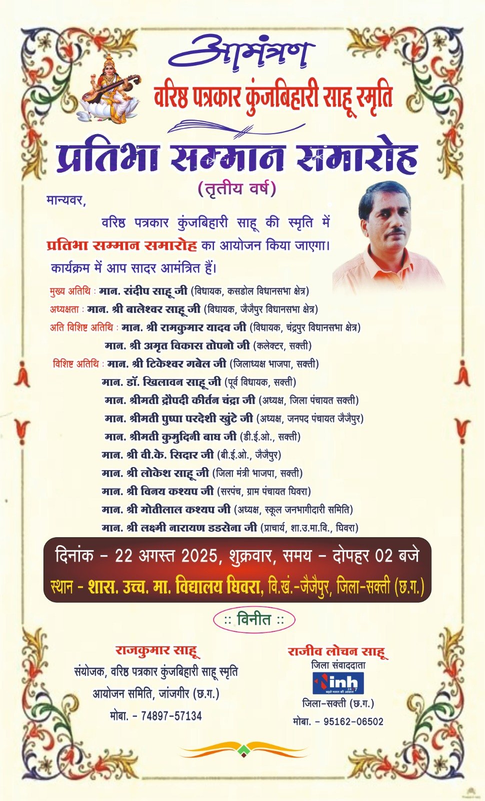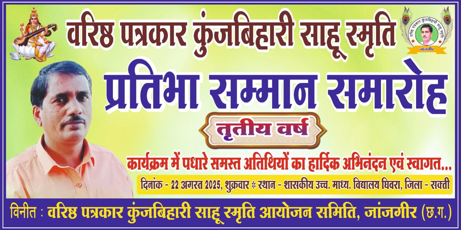 वरिष्ठ पत्रकार कुंजबिहारी साहू स्मृति आयोजन समिति के संयोजक राजकुमार साहू और सदस्य राजीव लोचन साहू ने अभिभावकों, ग्रामवासियों समेत क्षेत्र के लोगों से कार्यक्रम में शामिल होने की अपील की है.