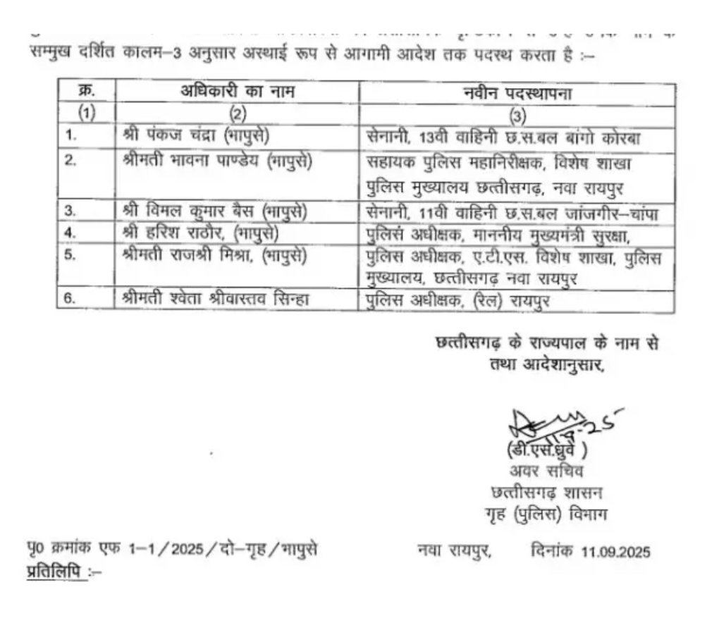 CG News : 6 IPS का ट्रांसफर… इन पदों में मिली पोस्टिंग, गृह विभाग ने जारी किया आदेश…