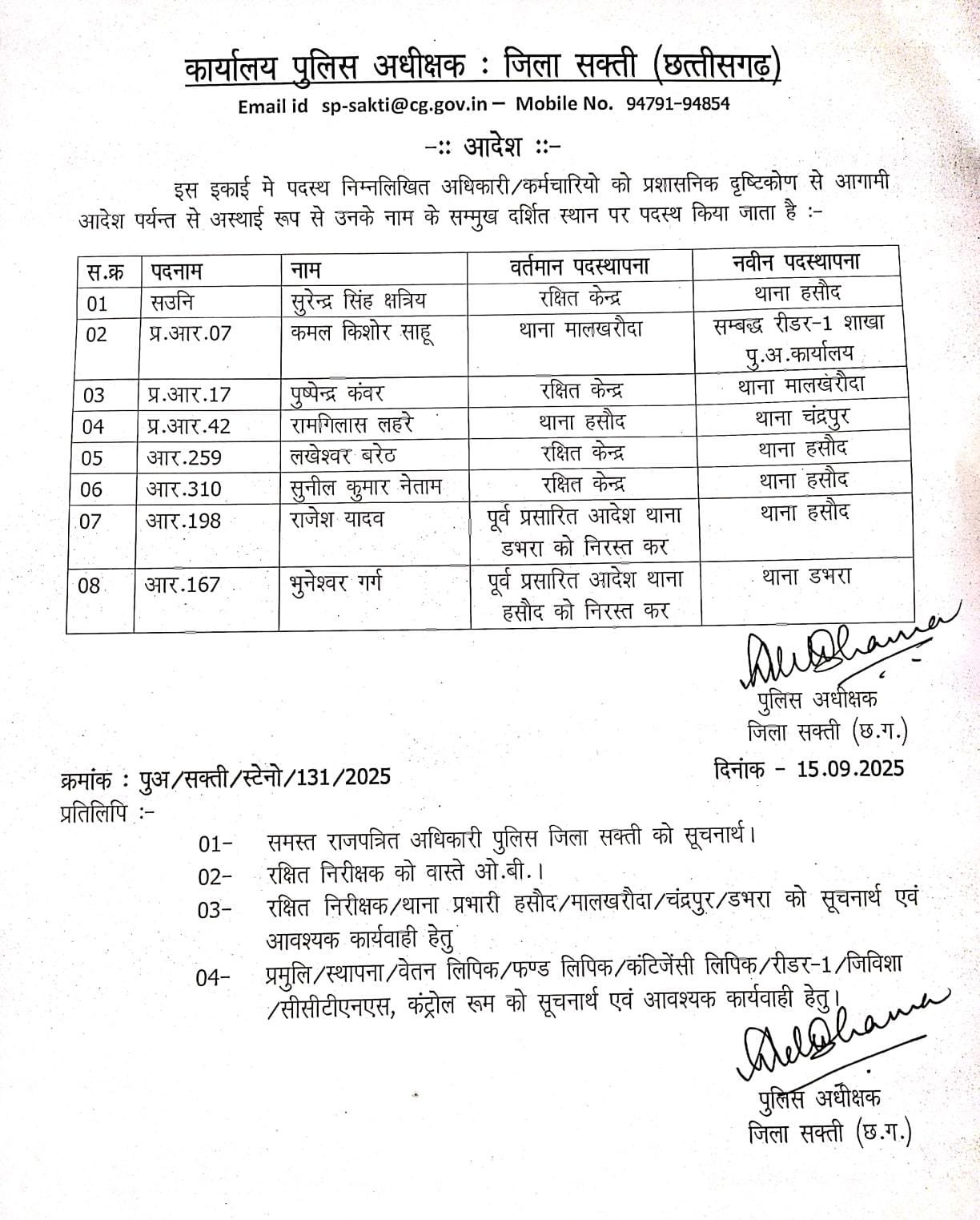 Sakti Police Transfer News : ASI, प्रधान आरक्षक सहित 8 पुलिसकर्मियों का हुआ ट्रांसफर, एसपी अंकिता शर्मा ने जारी किया आदेश… देखिए सूची…