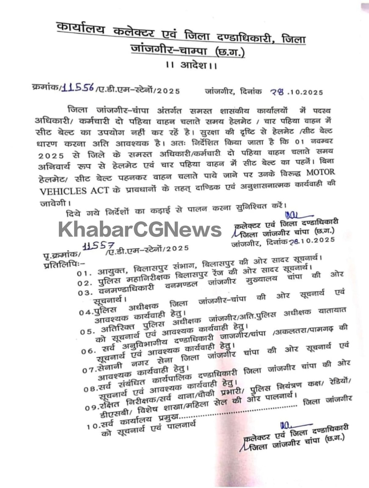 JanjgirChampa Big News : एसपी के बाद कलेक्टर ने हेलमेट को लेकर आदेश जारी किया, 1 नवंबर से शासकीय कर्मचारी हेलमेट लगाकर बाइक चलाएंगे, कार सवार सीट बेल्ट बांधेंगे, कलेक्टर जन्मेजय महोबे ने आदेश जारी किया, आदेश में ये लिखी बड़ी बात… पढ़िए…
