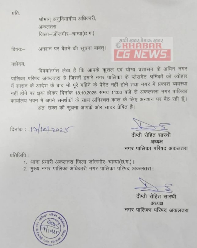JanjgirChampa Big News : अकलतरा नपा के 100 प्लेसमेंट कर्मचारियों को वेतन जारी हुआ, अध्यक्ष दीप्ति रोहित सारथी ने दी थी अनशन की चेतावनी, अध्यक्ष की पहल से प्लेसमेंट कर्मचारियों की मनेगी हैप्पी वाली दीपावली…