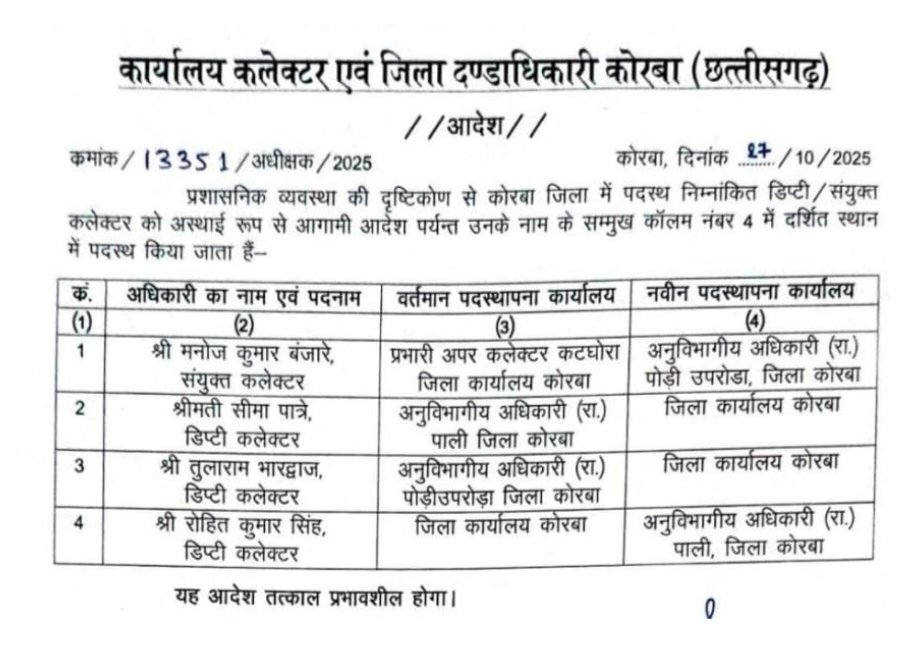 Korba News : एक संयुक्त कलेक्टर और 3 डिप्टी कलेक्टर के तबादले, कलेक्टर के आदेश के बाद अब ये अधिकारी बने SDM… देखिए आदेश…