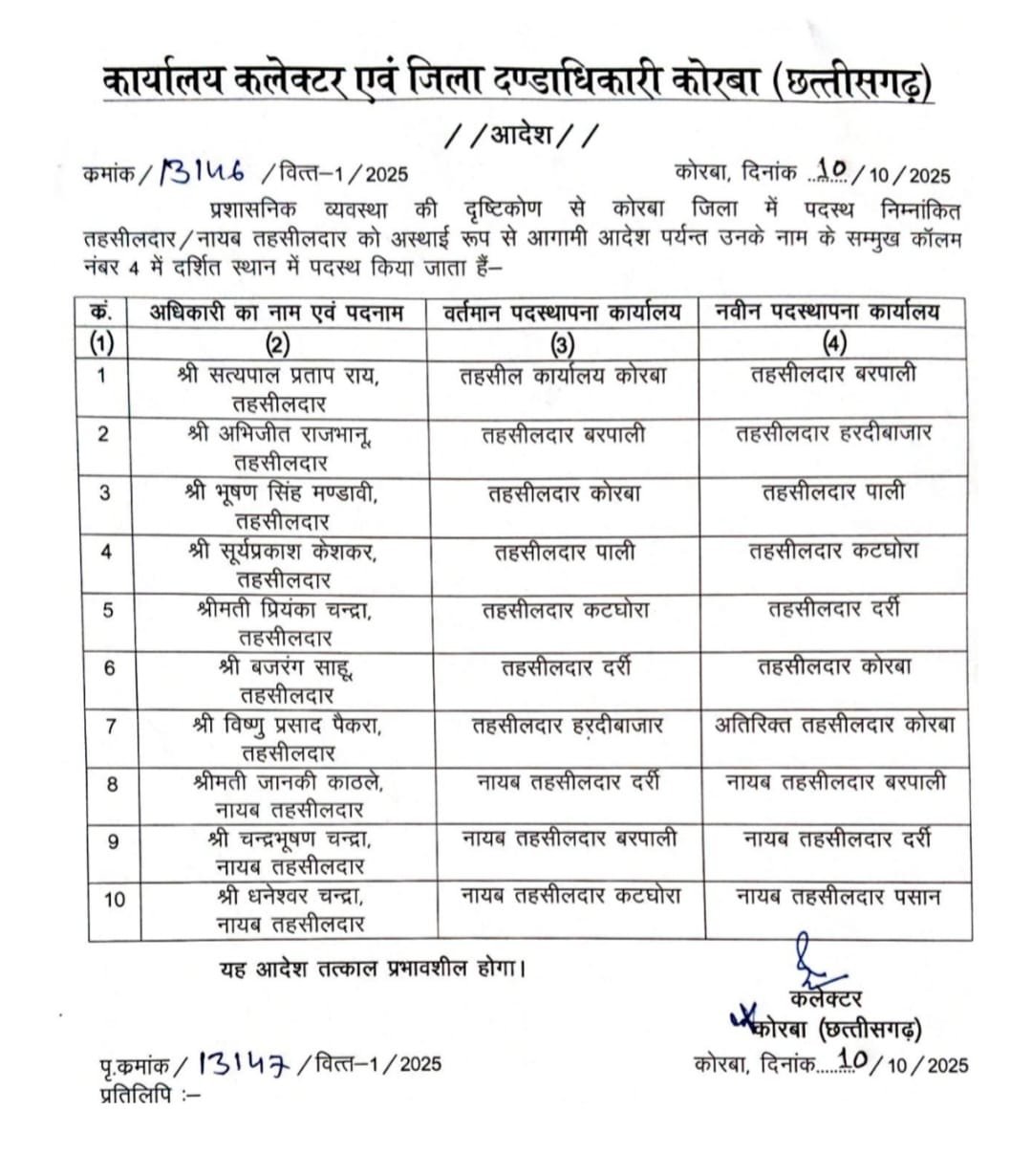 Korba Transfer : कलेक्टर अजीत वसंत ने तहसीलदारों के बदले प्रभार, जिले के 10 तहसीलदार और नायब तहसीलदार के तबादले… देखिए आदेश…