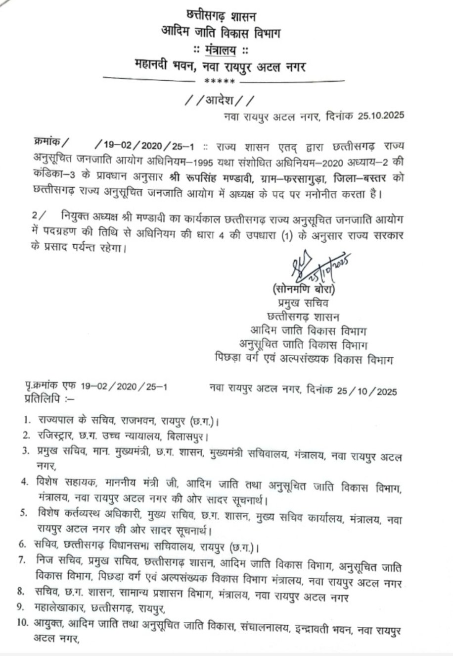 Raipur : रूपसिंह मंडावी बने राज्य अनुसूचित जनजाति आयोग के अध्यक्ष, राज्य सरकार ने जारी किया आदेश…