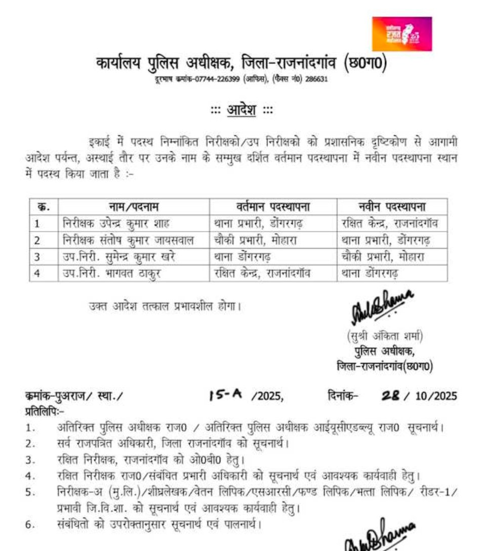 Rajnandgaon Action News : एसपी अंकिता शर्मा ने पदभार ग्रहण करते ही एक्शन लिया, थाना प्रभारियों का ट्रांसफर किया, लाइन अटैच भी किया…