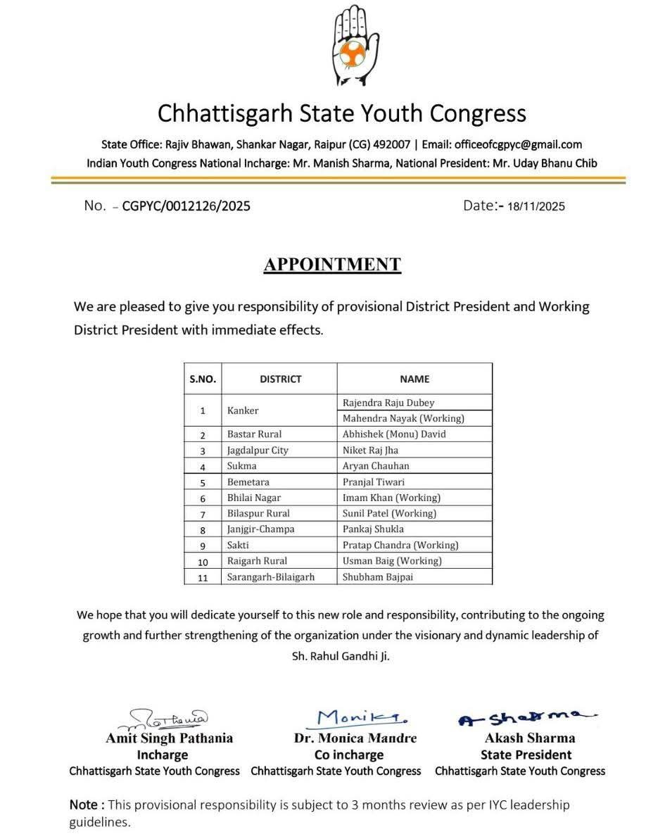 CG News : छग में युवा कांग्रेस ने कई जिलों में जिलाध्यक्ष बदले, अब इन्हें मिली जिम्मेदारी, देखिए सूची…