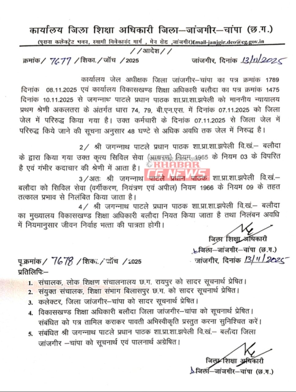 JanjgirChampa Teacher Suspend : शिक्षक जगन्नाथ पाटले को DEO ने सस्पेंड किया, महिला से छेड़छाड़ के मामले में जेल जाने पर हुई कार्रवाई… देखिए आदेश…