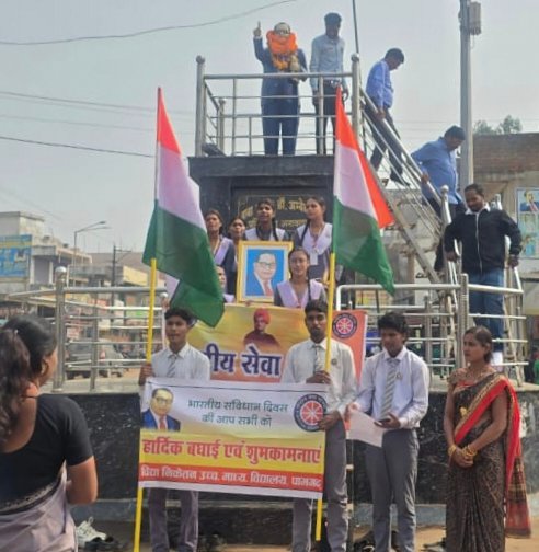 पामगढ़. राष्ट्रीय सेवा योजना इकाई विद्या निकेतन उच्चतर माध्यमिक विद्यालय पामगढ़ एवं ड्रीमलैंड पब्लिक स्कूल पामगढ़ के संयुक्त तत्वाधान से “संविधान दिवस” के अवसर पर डॉक्टर भीमराव अंबेडकर को याद करते हुए एवं समाज में भारतीय संविधान के महत्व को बतलाने के उद्देश्य से विद्यालय के बच्चों द्वारा विद्यालय परिसर से तहसील चौक होते हुए अंबेडकर चौक तक भव्य रैली का आयोजन किया गया.
