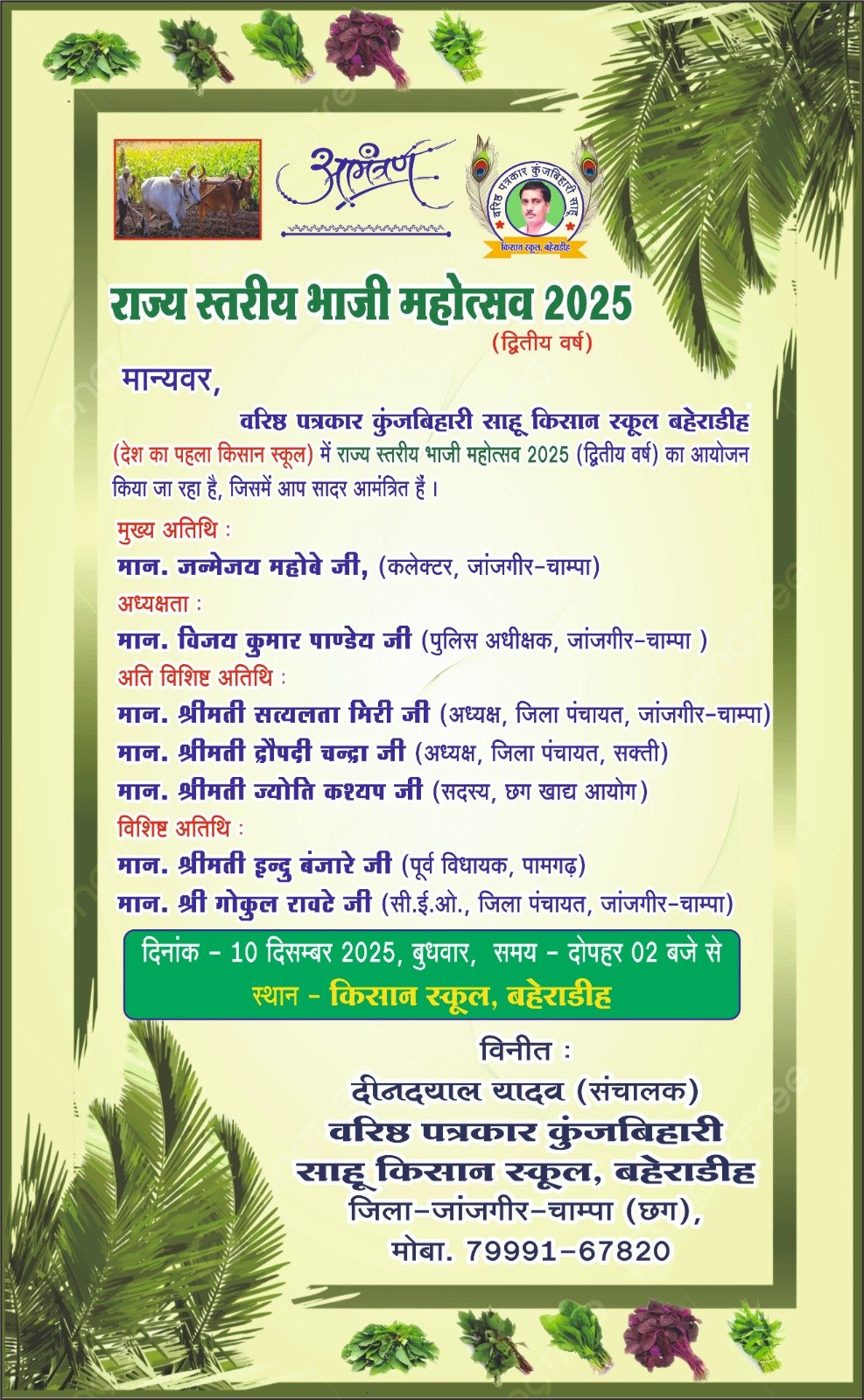 वरिष्ठ पत्रकार कुंजबिहारी साहू किसान स्कूल बहेराडीह के संचालक दीनदयाल यादव ने बताया कि किसान स्कूल में द्वितीय वर्ष बुधवार 10 दिसंबर को दोपहर 2 बजे राज्य स्तरीय भाजी महोत्सव का आयोजन किया जा रहा है। महोत्सव के दौरान विविध प्रकार की भाजियों की जीवंत प्रदर्शनी लगाई जाएगी. महोत्सव को लेकर प्रदेश की महिलाओं और बिहान की दीदियों में जबरदस्त उत्साह का माहौल है.
