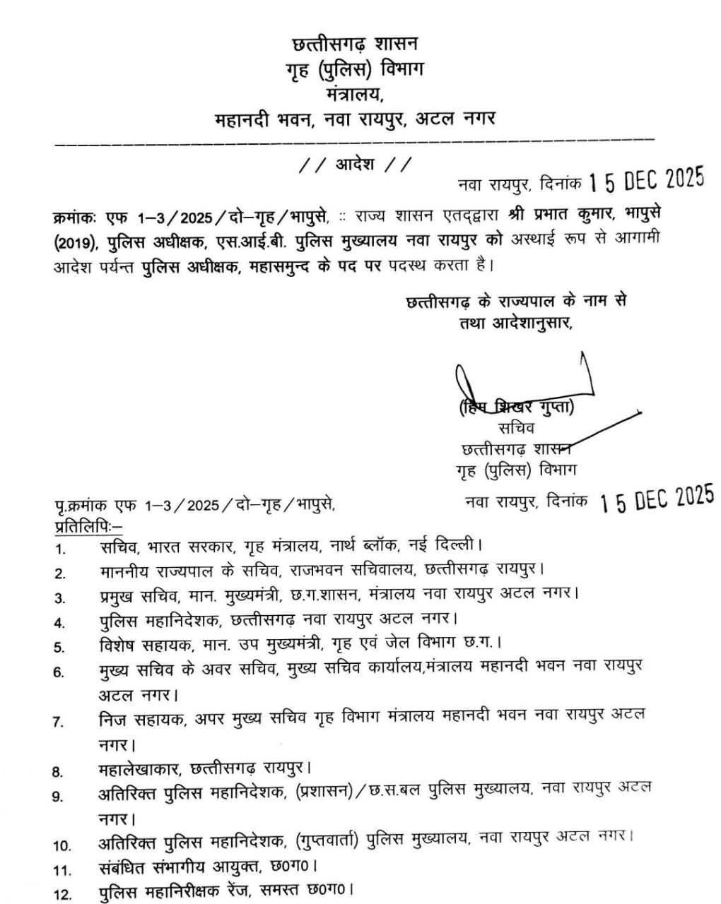 Raipur Big News : महासमुंद जिले के नए SP होंगे IPS प्रभात कुमार, पुलिस विभाग से आदेश जारी…