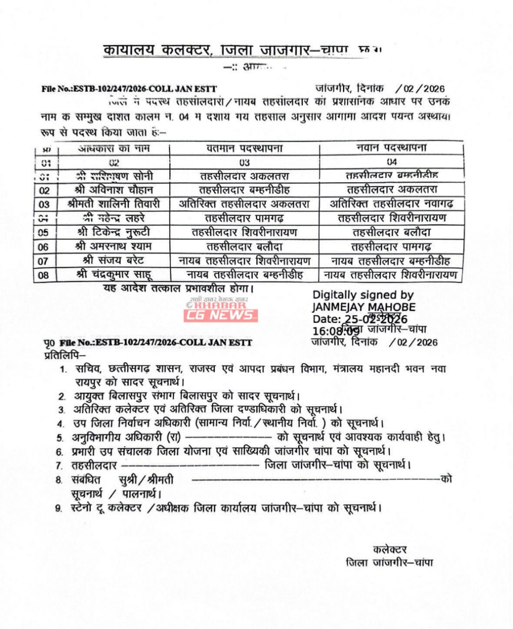 Janjgir Big News : तहसीलदार और नायब तहसीलदारों का हुआ तबादला, आदेश जारी हुआ…