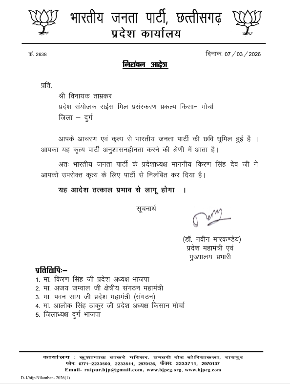 विनायक ताम्रकार के निलंबनको लेकर डिप्टी सीएम अरुण साव ने मीडिया से बात करते हुए कहा कि कोई भी हो, गैरकानूनी काम करने वाले पर कार्रवाई होगी। कांग्रेस के आरोपों पर डिप्टी CM अरुण साव ने कहा कि ‘अपराध और अपराधियों को संरक्षण कांग्रेस पार्टी देती है, कांग्रेस का अपराध के साथ संलिप्तता जग ज़ाहिर है। कांग्रेस राज्यसभा प्रत्याशी को लेकर भाजपा का पोस्टर पर अरुण साव ने प्रतिक्रिया देते हुए कहा कि BJP ने कांग्रेस की वास्तव स्थिति को देख पोस्ट किया है। कई कांग्रेस नेताओं के अरमान पूरे नहीं हुए हैं, फूलो देवी नेताम कांग्रेस नेताओं पर भारी पड़ीं हैं। कांग्रेस में परिवार की चलती है यह भी साबित हुआ है।