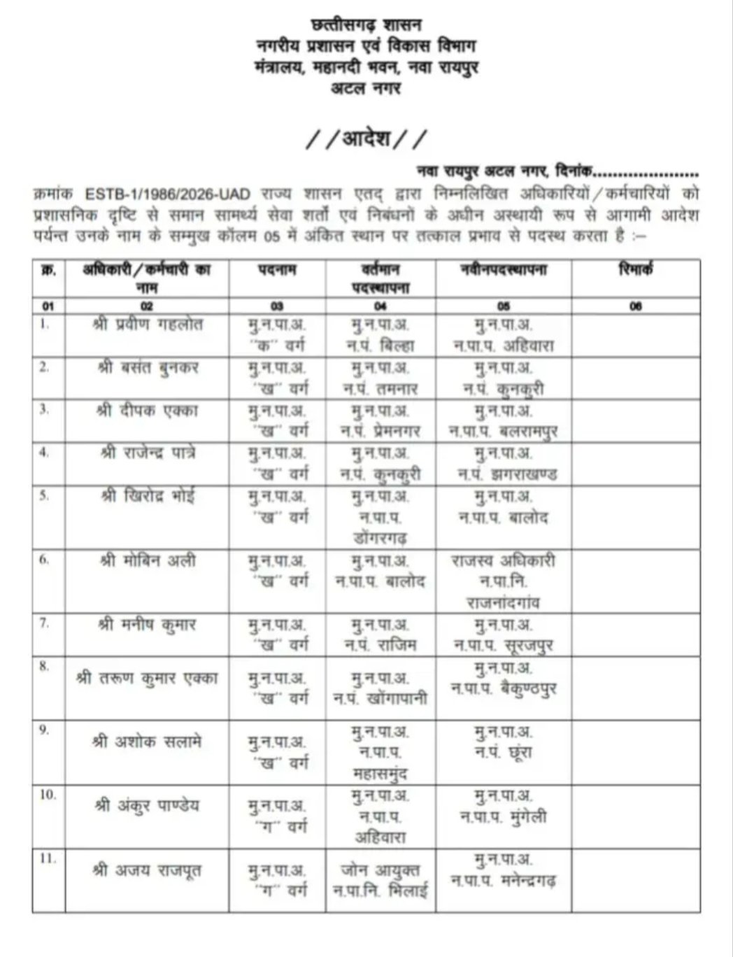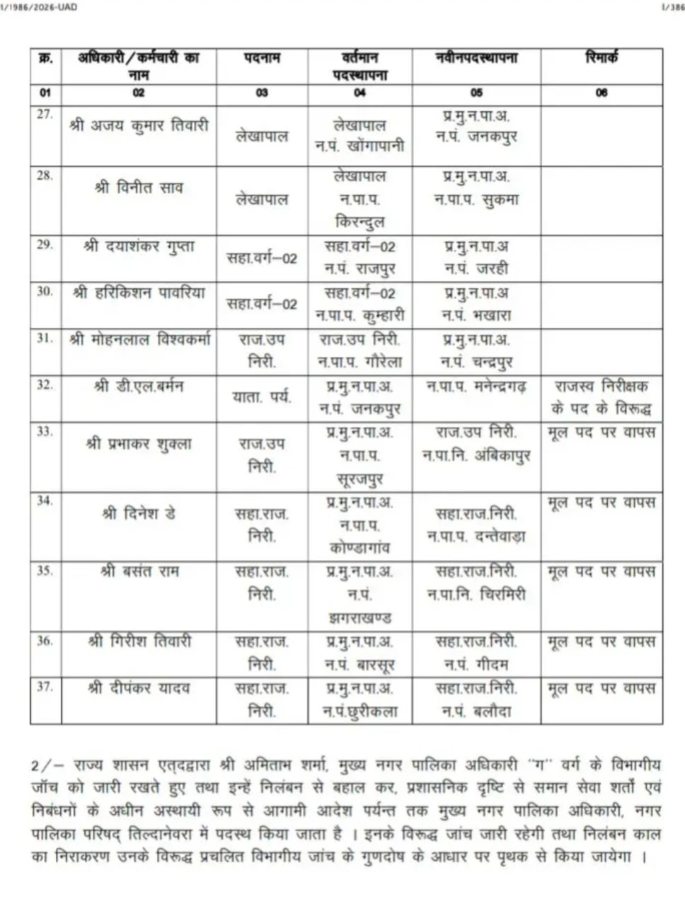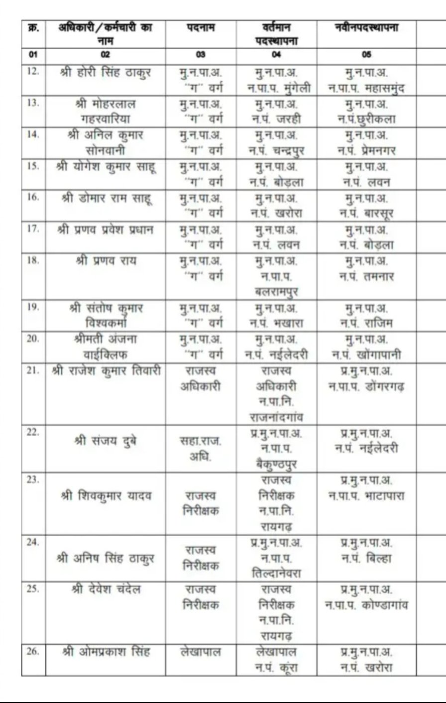 CG Big News : नगरीय निकाय के CMO और राजस्व निरीक्षकों के तबादले, देखिए आदेश…