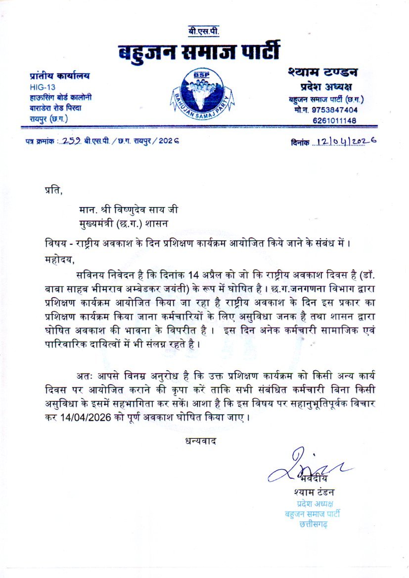 CG News : बसपा के प्रदेश अध्यक्ष श्याम टण्डन ने मुख्यमंत्री को पत्र लिखा, अंबेडकर जयंती के दिन अवकाश के बाद भी ट्रेनिंग, अवकाश देने की मांग, ये लिखा पत्र में, जानिए…