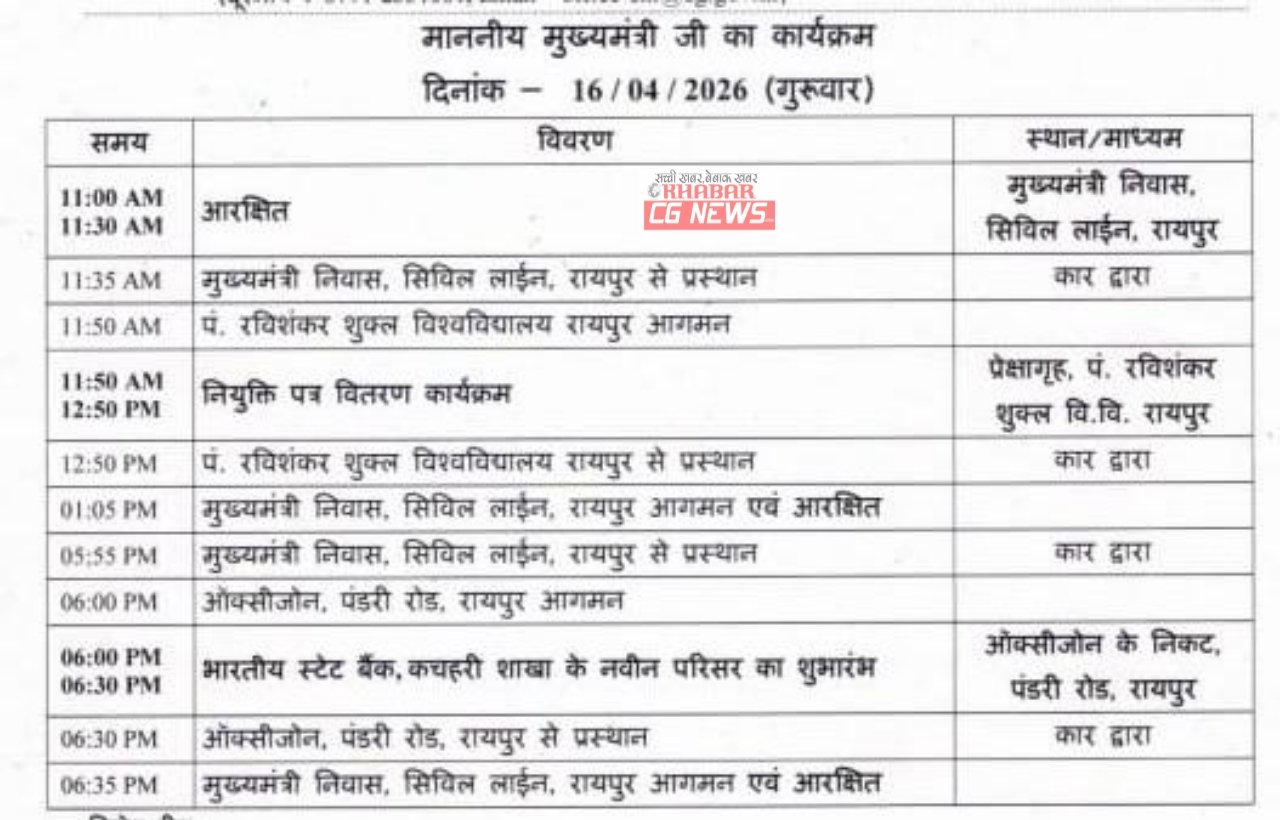 CG News : CM विष्णुदेव साय का 16 अप्रेल को दौरा कार्यक्रम, जारी हुआ प्रोटोकॉल…