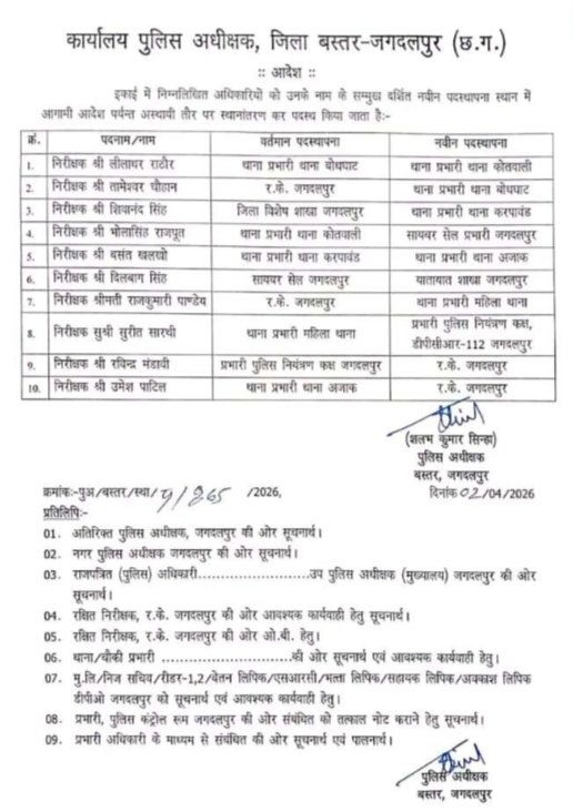 Jagdalpur Police Transfer : 10 TI के तबादले, SP ने जारी किया आदेश… देखिए सूची…