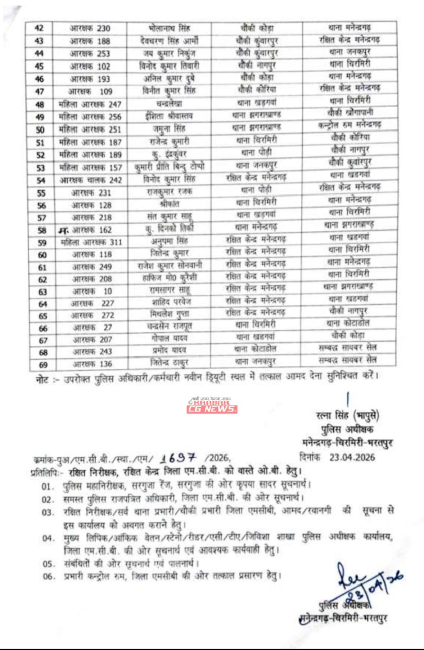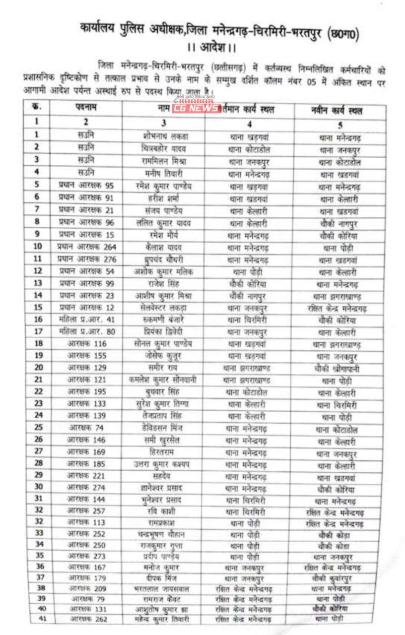 Manendragarh : पुलिसकर्मियों के तबादले, SP ने जारी किया आदेश, देखिए सूची…