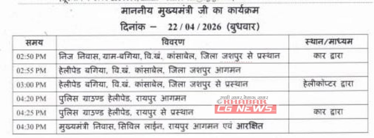 CG News : CM विष्णुदेव साय का 20 और 21 अप्रेल को दौरा कार्यक्रम, जारी हुआ प्रोटोकॉल, देखिए पूरा शेड्...