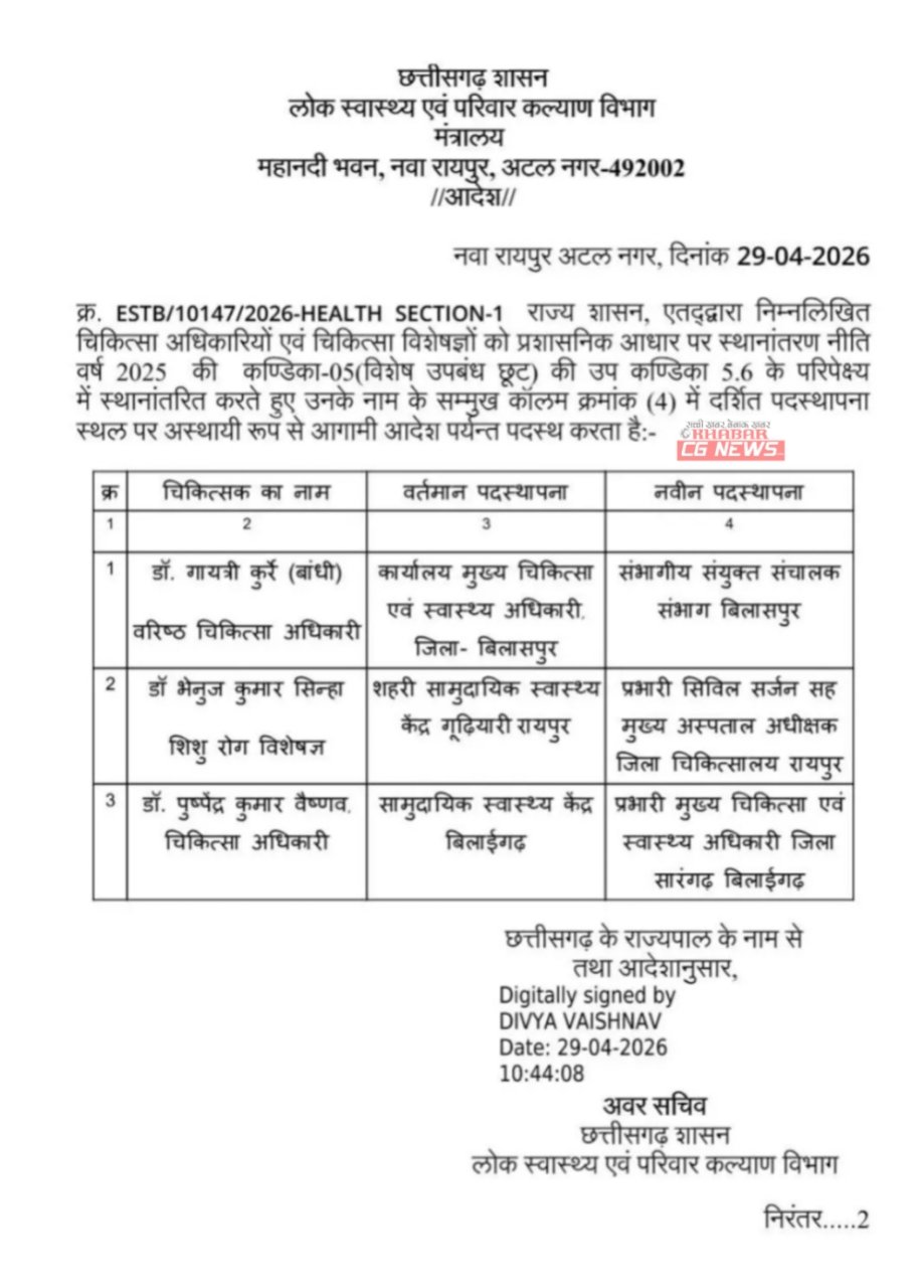 Raipur : स्वास्थ्य अधिकारियों का तबादला… देखिए आदेश…
