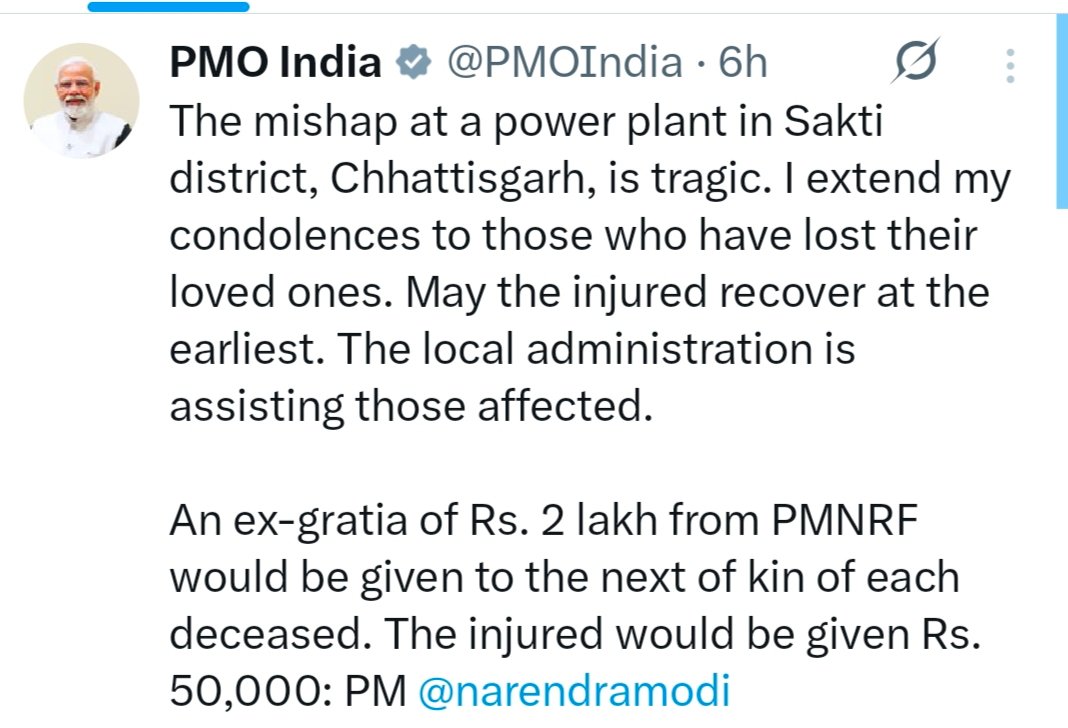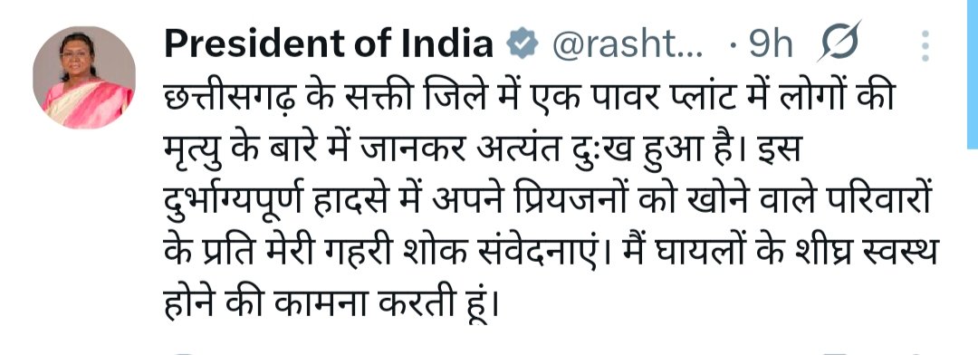 सक्ती जिले के वेदांता पॉवर प्लांट में हादसे की गूंज दिल्ली तक, राष्ट्रपति द्रौपदी मुर्मू ने भी हादसे पर दुख जताया, X पर पोस्ट कर व्यक्त की शोक संवेदना, PMO ने भी पोस्ट किया था, PM नरेंद्र मोदी ने भी जताया है दुख… अब तक 14 मजदूरों की मौत की हो चुकी पुष्टि, 19 मजदूरों का इलाज जारी, कई मजदूर की हालत नाजुक… कल 14 अप्रेल को दोपहर 2:30 बजे हुआ था हादसा, अभी बढ़ सकता है मौत का आंकड़ा…