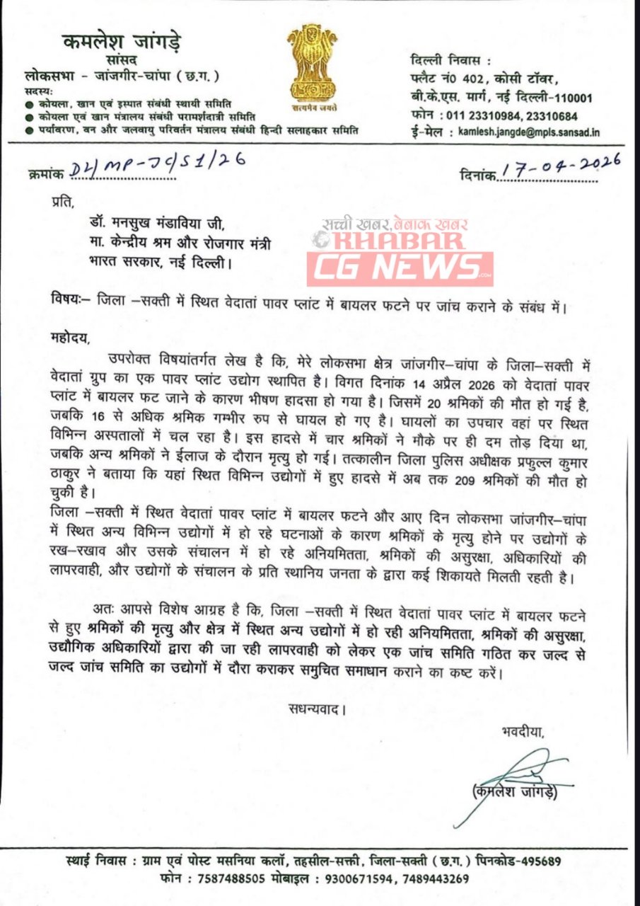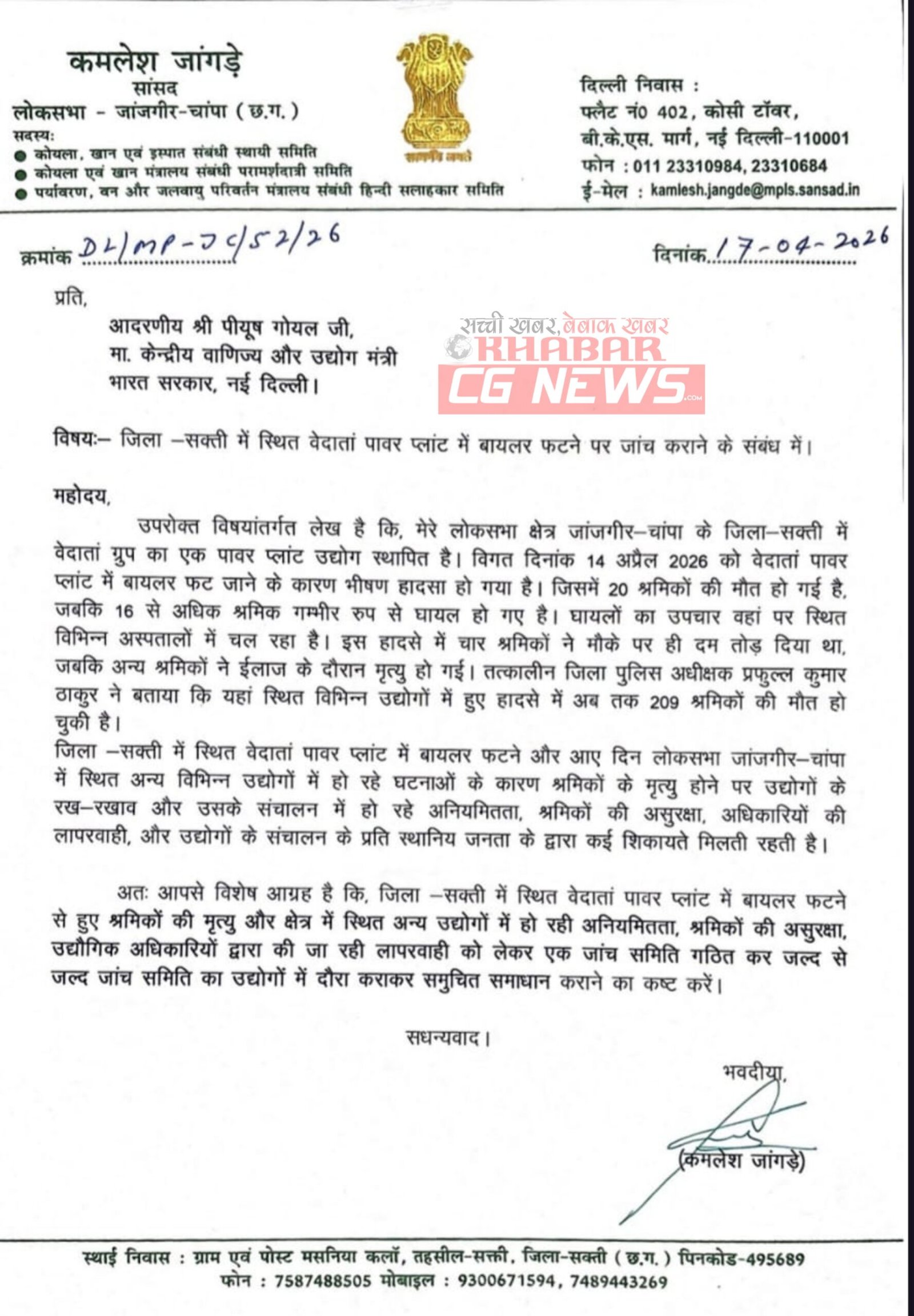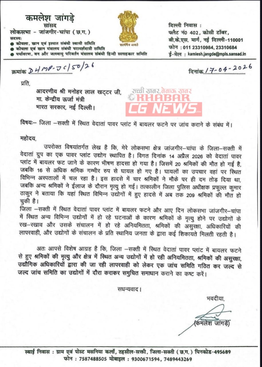 पत्र में सांसद ने बताया कि हादसे में लगभग 20 श्रमिकों की मौत हुई है, जबकि 16 से अधिक श्रमिक गंभीर रूप से घायल हुए हैं, जिनका उपचार विभिन्न अस्पतालों में जारी है. कुछ श्रमिकों की मौके पर ही मौत हो गई, जबकि अन्य की इलाज के दौरान मृत्यु हुई. सांसद कमलेश जांगड़े ने कहा कि यह घटना उद्योगों में सुरक्षा मानकों की अनदेखी, प्रशासनिक लापरवाही और श्रमिकों की सुरक्षा में गंभीर कमी को दर्शाती है. उन्होंने केंद्र सरकार से मांग की है कि मामले की निष्पक्ष जांच के लिए उच्च स्तरीय समिति का गठन किया जाए तथा जिले के अन्य उद्योगों की भी जांच कर दोषियों के खिलाफ कड़ी कार्रवाई की जाए.