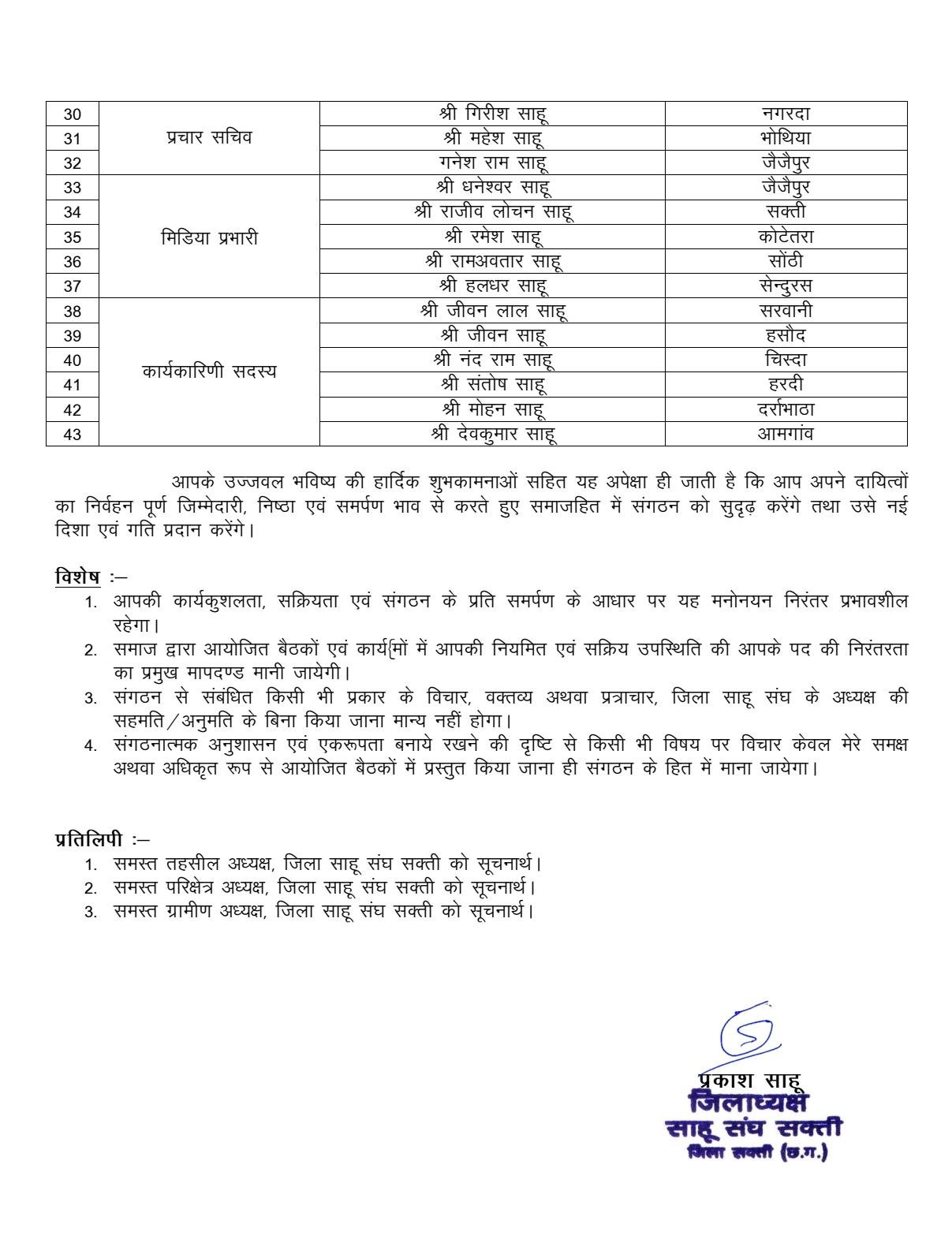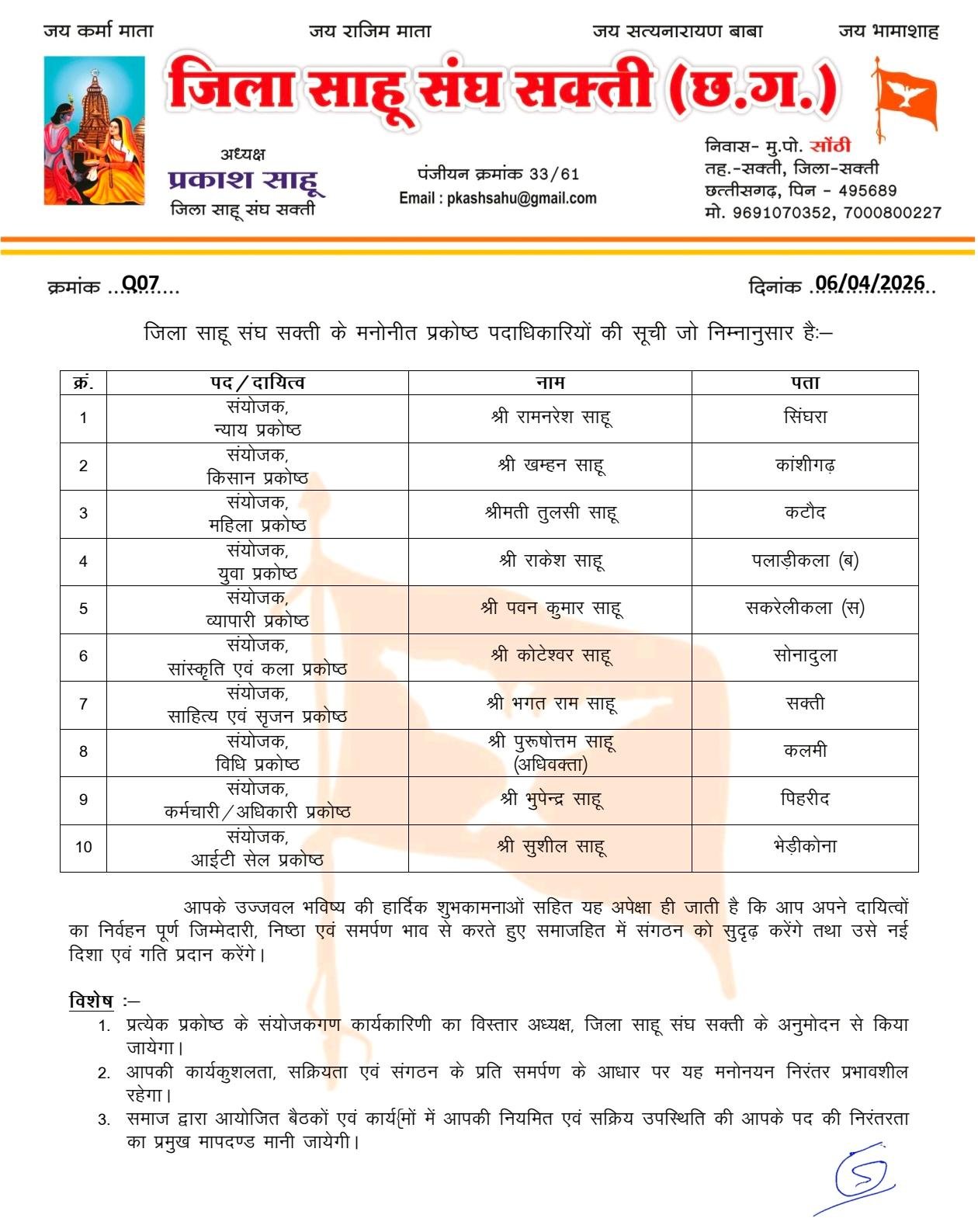 Sakti News : जिला साहू संघ सक्ती के जिलाध्यक्ष प्रकाश साहू ने कार्यकारणी का किया विस्तार, संरक्षक, सलाहकार, उपाध्यक्ष, सचिव सहित अन्य पदाधिकारियों की नियुक्ति की… देखिए पूरी सूची…