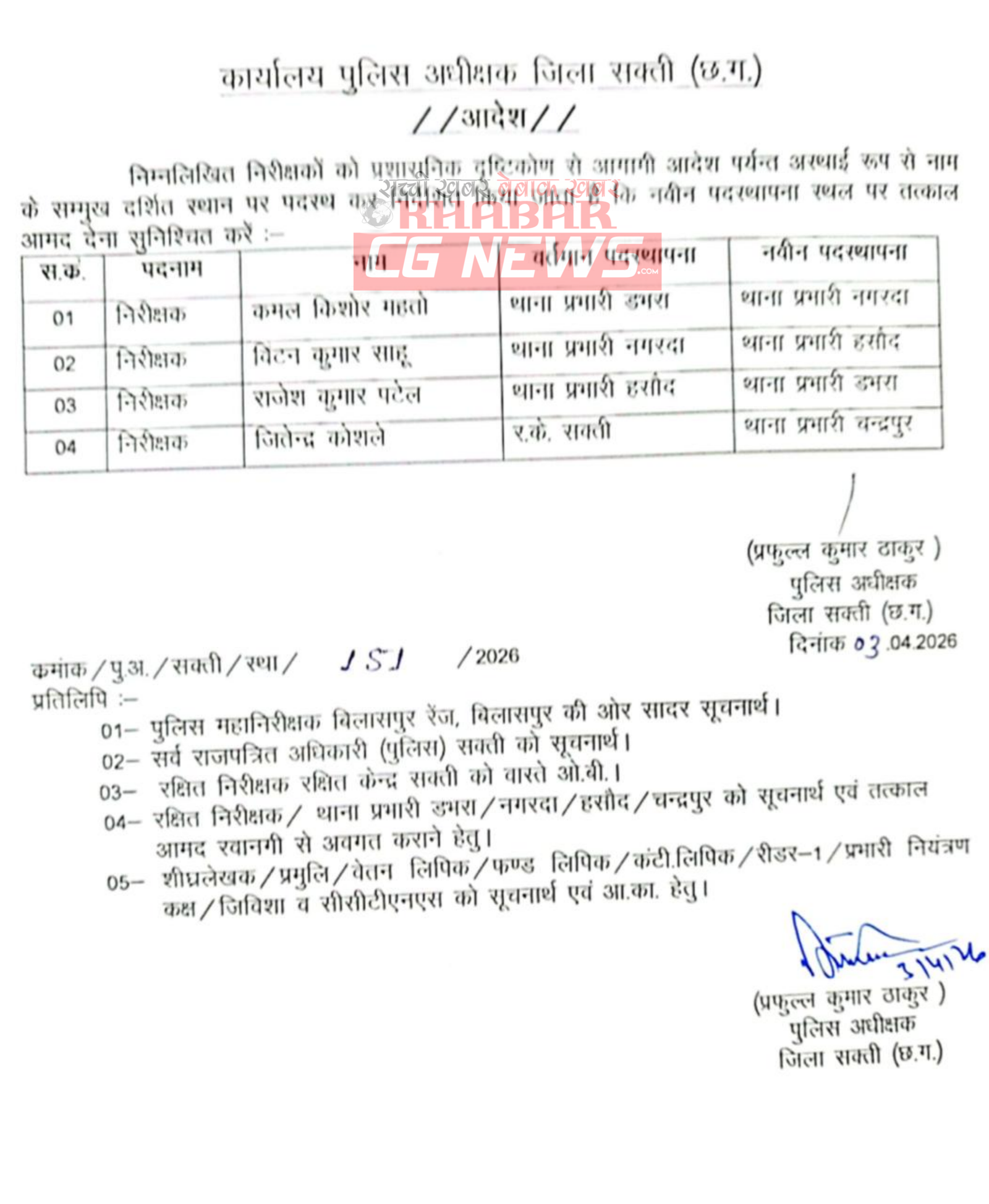 Sakti Police Transfer News : 4 निरीक्षकों का तबादला, SP प्रफुल्ल ठाकुर ने जारी किया आदेश… किन्हें, कहां-कहां मिली जिम्मेदारी… देखिए लिस्ट