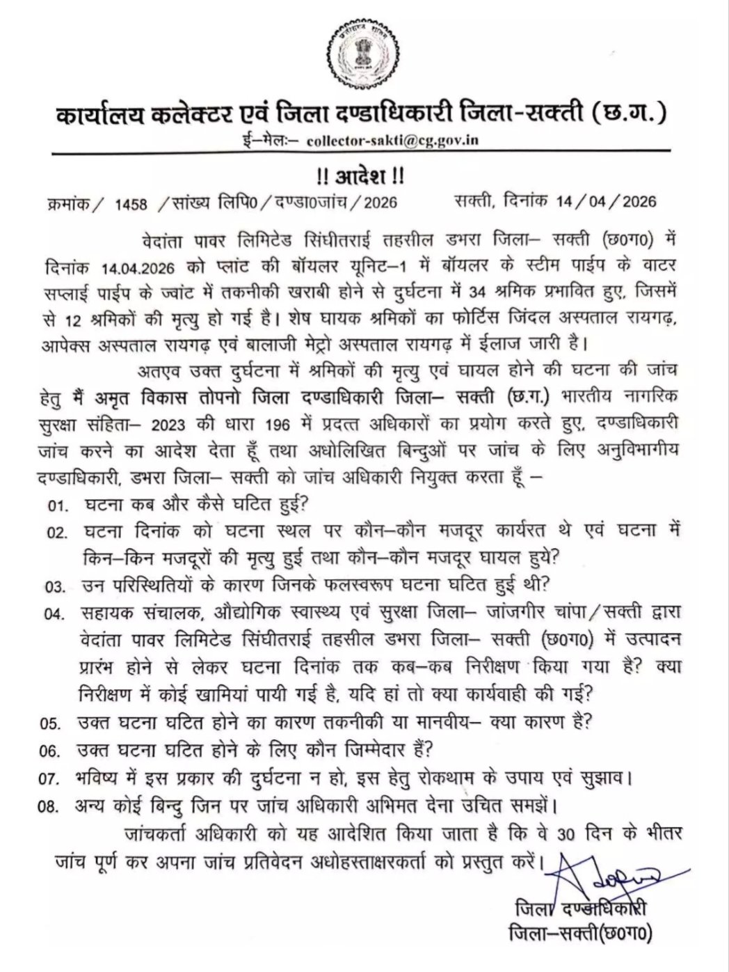 Sakti Big News : कलेक्टर ने 30 दिन के भीतर वेदांता पावर प्लांट हादसे की जांच रिपोर्ट मांगा, डभरा SDM करेंगे जांच… देखिए… आदेश में क्या लिखा…