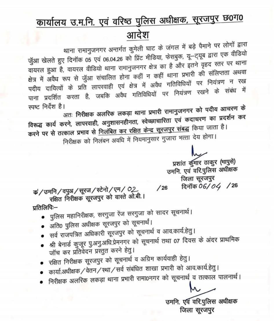 सूरजपुर बड़ी खबर : टीआई को एसपी ने सस्पेंड किया, आदेश जारी, ये रही निलंबन की बड़ी वजह… देखिए आदेश…